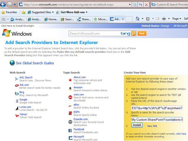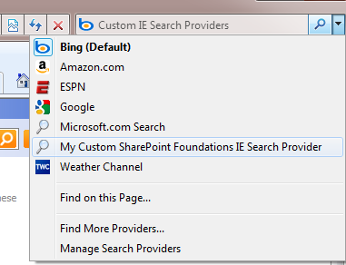 How many times have you thought of ways that could help you bring people into your SharePoint portal. Ways that can help sell SharePoint internally. You want your users to really use SharePoint for everything they do. Well, if you’ve done or worked on search solutions, you probably seen or heard of custom IE search providers.