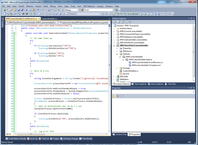03. JMHCustomInstaller Event Receiver – I added an event receiver to this feature. I removed all the overrides from the class except for the FeatureActivated event. I’d like to use this to initiate the InstallUtil.exe process and create my custom event log. I added few using statements as well: System.Diagnostics, and System.IO. I also changed the namespace. The code is as follows.