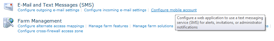 Let’s get to it. To configure this new feature, access the Central Administration site and click on the System Settings group hyperlink. On that page, you’ll see a Configure Mobile Account link. This configuration page is also available from the Application Management page and can be applied per web application.