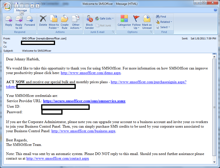 I initially created an account with MessageMedia. They offer several APIs for their service. It wasn’t exactly what I was looking for. Before I found out I need a OMS URL, I figured it may be a simple REST or ASMX service, but that didn’t go. So I went ahead and registered for SMS Officer. SMS Officer sent me a confirmation email message with an OMS URL in it. This is what we want. In addition, SMS Officer will send you a confirmation code via SMS to your phone.