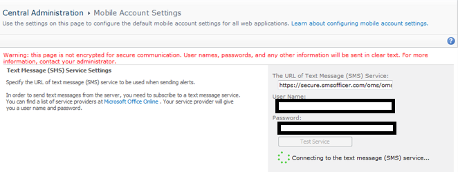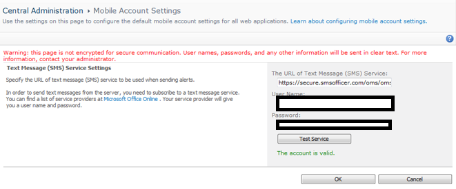 Now before we go ahead and configure this feature, you will first need to create an account with one of the SMS Service Providers out there. I can’t say any provider will do, because I really don’t know much about them or what exactly they offer. The most important piece of information you need is their SMS Service URL and if it is serviced over SSL or not. Depending on where you live and your mobile phone provider is, you may have a different URL for the service. It turns out that the URL used to configure this must be based off of Microsoft’s own Office Mobile Service protocol. This protocol is explain in more details here on MSDN.