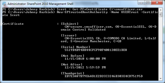 Now that you’ve downloaded the certificate, we will need to install it on our SharePoint 2010 server. We’ll use PowerShell to do that. The key here is to use the Root Certificate Path as the name. PowerShell commands and explanation on them can be found here on TechNet.