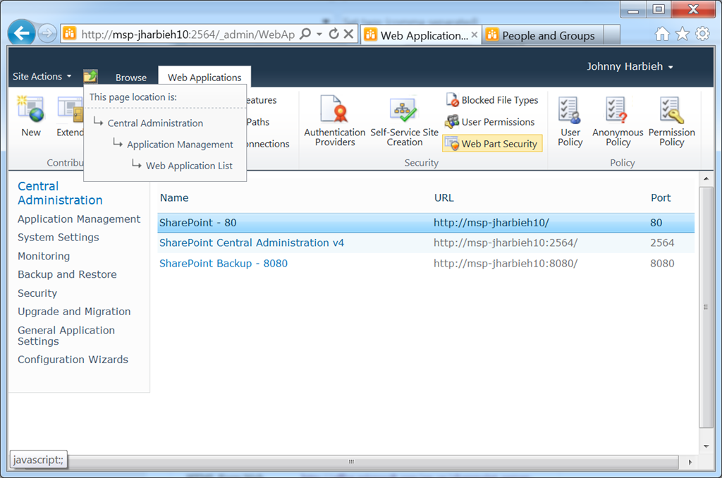 2. Select the Web Application you wish to modify the Web Part Security settings for